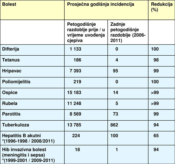 Sustavnim cijepljenjem prema Programu obveznih cijepljenja postignuta je eradikacija velikih boginja, dječje paralize i difterije. Znatno je reducirana incidencija svih ostalih bolesti protiv kojih se cijepi, posebice tetanusa koji se više ne bilježi u radno aktivnom stanovništvu, ali i tuberkuloznog meningitisa i milijarne tuberkuloze u dojenčadi. (slika 2.) Usprkos do sada redovito dostignutom zakonom propisanom cjepnom obuhvatu protiv ospica, rubeole i zaušnjaka u Hrvatskoj (95%), a zbog činjenice nedostizanja cjepnog obuhvata u našoj bližoj i daljnjoj okolini, kao i osobitosti samih bolesti, npr. ospica koje su visoko zarazne, postoji mogućnost unošenja tih bolesti u našu sredinu. Stoga je neophodno važno da se zakonom propisani cjepni obuhvati održe i nadalje.